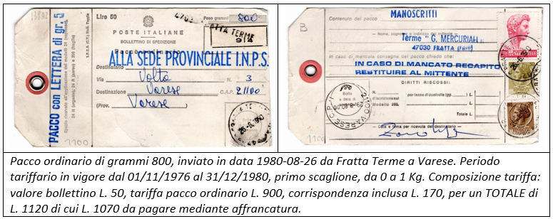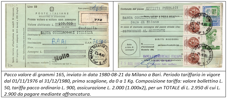 Altre immagini: http://portalepacchi.it/cgi-bin/selectDB.cgi?bollettinoCatalogo=138b1 Il bollettino 138c1 illustrato nella figura sotto è partito in data 21 agosto 1980. L’indicazione della stamperia è Roma – Istituto Poligrafico dello Stato P.V., non ho invece mai visto la versione indicata dal catalogo con il n. 138c2 che dovrebbe avere l’indicazione della stamperia “Roma – Istituto Poligrafico e Zecca dello Stato”. Su questo specifico bollettino segnalo l’utilizzo dei francobolli perfin “B.C.I”, in generale l’uso dei francobolli perfin non è comune in questo periodo, ma non sono difficili da reperire su bollettini inviati da istituti bancari.