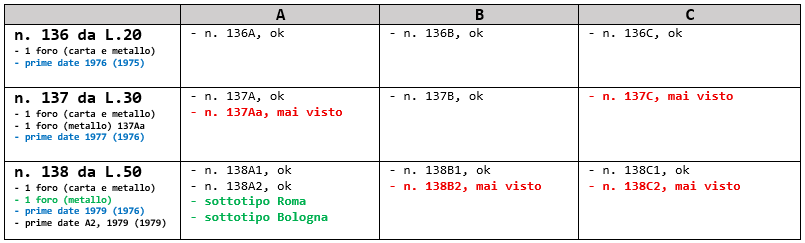 La seguente tabella riassume le considerazioni discusse in questo articolo. Dove si trova scritto ok significa che, a meno di dettagli (e.g., abbreviazioni diverse sull’indicazione della stamperia), la descrizione sul catalogo Interitalia corrisponde ai bollettini effettivamente ritrovati. Le scritte in verde in tabella segnalano l’esistenza di sottotipi non catalogati. Le scritte in rosso segnalano sottotipi catalogati che non ho ancora avuto il piacere di vedere. Le scritte in azzurro segnalano prime date antecedenti a quelle indicate sul catalogo Interitalia che ho riportato tra parentesi.