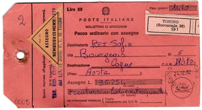 Lo sconto sull’assegno era applicato soltanto entro certi limiti di valore dell’assegno stesso e negli anni assunse diverse consistenze (50% e 28%) anche in funzione del metodo di pagamento utilizzato (vaglia o conto corrente postale). I due bollettini illustrati sotto sono del tutto analoghi (periodo tariffario, scaglione peso, contenuto). Tuttavia, solo al secondo pacco è stato applicato lo sconto del 50% sulla tariffa di assegno, perché nel primo pacco il valore dell’assegno superava la soglia di L. 50.000, massimo valore consentito per fruire dello sconto.