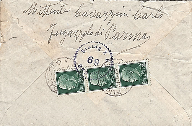 Figura 5 - Cartolina di Fugazzolo del luglio 1943 (Foto da web). Con ogni probabilità il destinatario non rimase a lungo in Grecia. I timbri in viola dello Stalag X-B (matricola 69) indicano infatti il suo successivo internamento in Germania, nel campo di prigionia situato nei pressi di Sandbostel, in Bassa Sassonia. Qui le autorità tedesche operarono una simil- censura, timbrando non solo l’involucro, ma anche le parti interne che potevano, in qualche modo, fornire informazioni sensibili agli internati. Lo stesso timbro che è riportato all’esterno della lettera è anche ripetuto all’interno del manoscritto a cancellare parzialmente l’informazione relativa all’arrivo previsto degli Alpini sulla Cisa.