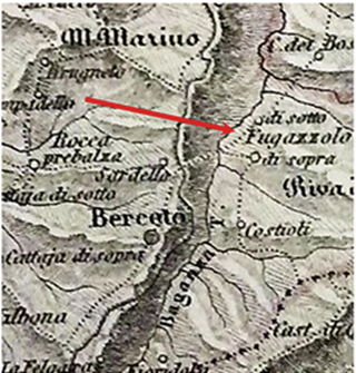 Figura 4 - Localizzazione di Fugazzolo nella montagna parmense La lettera è affrancata a Fugazzolo con una striscia di tre francobolli da 25 centesimi della serie “Imperiale”, per un totale di 75 centesimi, corrispondenti alla tariffa di doppio porto per lettere dirette a militari. Il contenuto costituisce una preziosa testimonianza del clima e degli avvenimenti del periodo: "Carissimo figlio, rispondo alla tua lettera in data 18-8-1943 ricevuta ieri sera, la quale mi ha fatto molto piacere, e sentire che al momento stai bene di salute. Così possiamo assicurarti di noi tutti a casa. Ho al momento alcune notizie di Nando, che ha scritto in data 13-8-43, ed Egisto che ha scritto in data 6-8-43, mentre di Francesco non si sa nulla. Sento pure che anche un altro di Fugazzolo si trova nel tuo reparto. Qui a Berceto si trovano molti tedeschi e a Parma dicono che alla Cisa devono arrivare molti alpini nostri. Altro non saprei che inviarti tanti saluti e baci da tutti noi. Scrivi sovente, che ne abbiamo piacere."