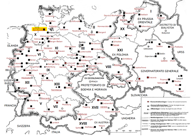 Figura 7 - Mappa della Germania del III Reich con l’evidenziazione di Sandbostel, I prigionieri anglo-americani godevano dello status di prigionieri di guerra secondo la Convenzione di Ginevra e ricevevano regolarmente pacchi dalla Croce Rossa Internazionale.