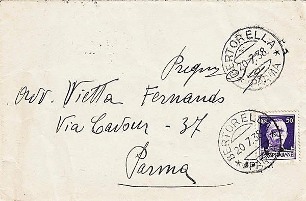 | Figura 18 Lettera da Bertorella a Parma del 20 Luglio 1938. L’annullo tipo “Guller” qui utilizzato è diverso da quello usato inizialmente perché non riporta più il numero frazionario. |