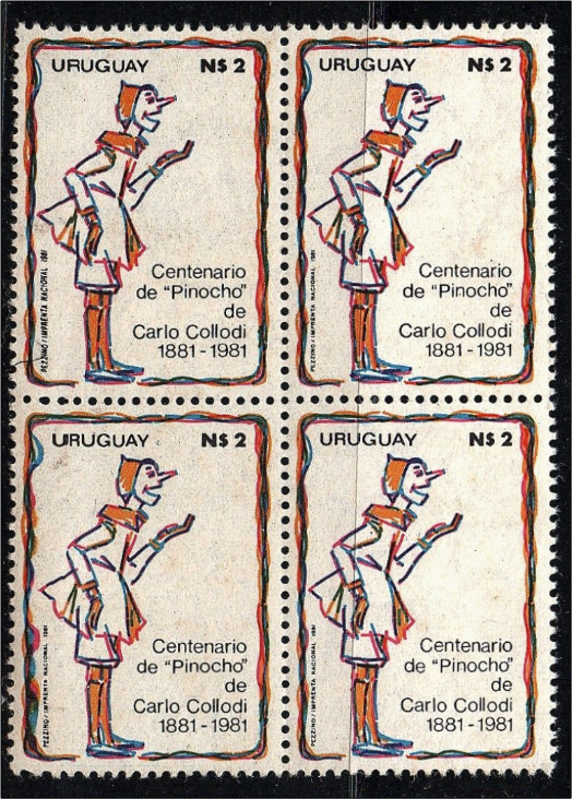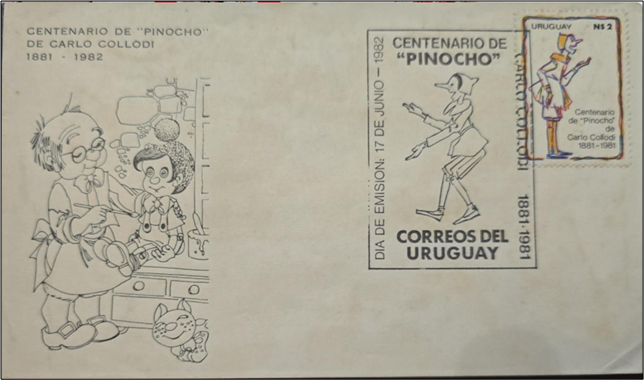 PERCORSO: le schede > Cartoline di Pistoia > questa pagina ll burattino di legno collodiano, Pinocho in spagnolo, è stato protagonista di una emissione in Uruguay nel centenario della nascita, nel 1981. C.F.N.P.