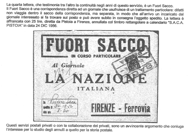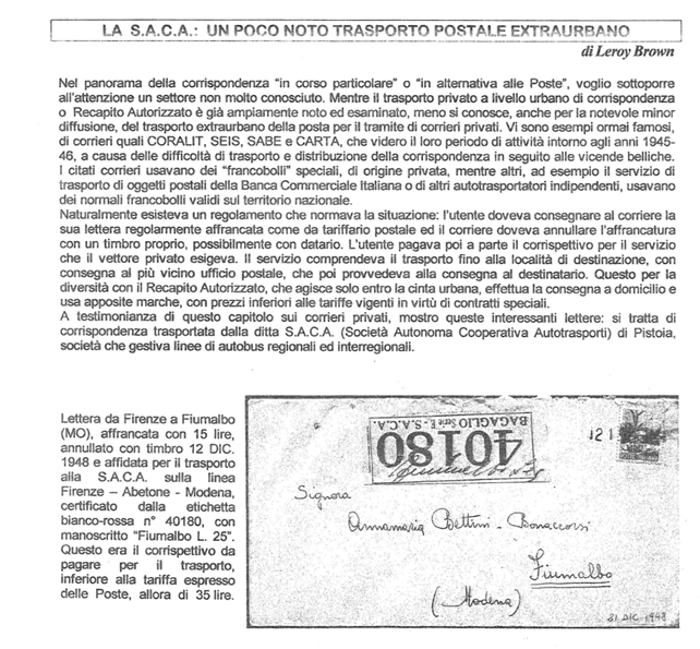 PERCORSO: le schede > Storia postale pistoiese > questa pagina Riproponiamo da “L’Annullo” N. 145 (Marzo 2004) l’articolo di Leroy Brown riguardante uno strano instradamento di corrispondenze tramite autolinee S.A.C.A.. Ringraziamo A.N.C.A.I. e il suo presidente Alcide Sortino, così come l’autore, per averne concesso la riproduzione. C.F.N.P.