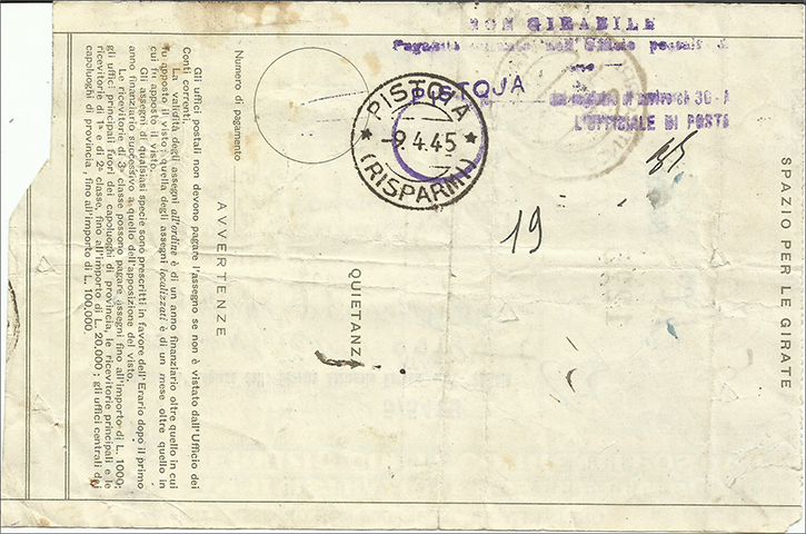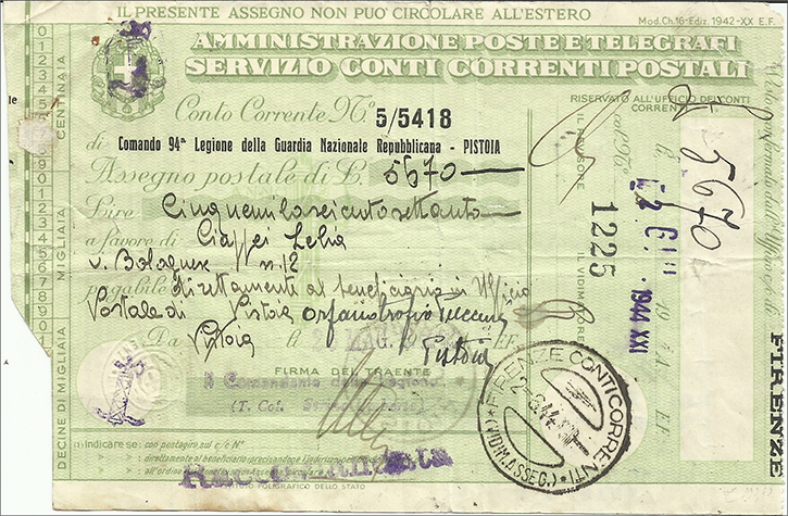 Talvolta è un oggetto che ti aiuta a capire le dinamiche delle cose di fronte a situazioni emergenziali. Esaminiamo l’oggetto: un assegno di conto corrente postale, tratto su di un conto di un correntista pistoiese. All’epoca, 1944, già da circa dieci anni, Pistoia aveva la sua direzione postale provinciale, di conseguenza alla nascita della propria provincia avvenuta nel 1927/1928. Come in più occasioni ricordato, però questa non aveva funzionalità contabili, per cui i servizi a denaro avevano capo ancora a Firenze; per questa ragione l’identificativo contabile degli Uffici Postali, il numero frazionario, aveva ancora mantenuto il connotato fiorentino, identificato nel numero numeratore 25. E cioè un conto corrente postale poteva essere radicato presso un ufficio pistoiese, ma poi doveva essere sottoposto alla verifica di convalida e vidima della sezione dedicata della Direzione di Firenze per essere pagato regolarmente. Così nella parte destra dell’assegno, vi era lo spazio riservato “alla convalida” dell’assegno, che ne garantiva la traenza e la solvibilità. E in questo caso l’ufficio fiorentino FIRENZE CONTI CORRENTI, apponeva il proprio bollo datario sullo spazio bianco circolare preposto (timbro di tipo guller con lunette vuote , diam. cm. 3,2, tra parentesi la dizione vidima assegni abbreviata). La particolarità dell’assegno in questione è che è tratto sul conto del Comando 94ª Legione della Guardia Nazionale Repubblicana di Pistoia, continuazione in R.S.I. di quella che fu la legione cittadina della Milizia Nazionale Volontaria di Sicurezza pistoiese, denominata “La Fedele”. Infatti la G.N.R. venne istituita incorporando anche le forze dei Carabinieri Reali ed in data 1/5/1944 venne istituito il Comando Provinciale della G.N.R. a Pistoia, con sede in Via dei Pappagalli n. 9, che sostituiva i disciolti Comandi dei CC.RR.. Quindi tra i primi atti che vennero assolti anche il pagamento di arretrati o servizi usufruiti; in questo caso il probabile affitto della Stazione dei Carabinieri a Capostrada, forse posto in una proprietà dell’ Orfanotrofio Puccini. Si staccò così un assegno di Lire 5.670 a favore di una signora, evidentemente referente per la riscossione. L’assegno tratto il 26/5/44 è a firma del Ten. Colonnello Umberto Strino, allora comandante della 94ª Legione, sino a quel momento comandante della Milizia di Pistoia. L’assegno di stampa ante R.S.I. (Mod. Ch.16 Ediz.1942) venne comunque utilizzato con la sovrimpressione delle nuove insegne governative (i fasci littori a tampone) ed il 2 giugno 1944 controllato e vidimato per regolarità a Firenze. Ma nel frattempo il territorio pistoiese entrò sotto diretto controllo tedesco, avvicinandosi la zona di guerra. Firenze fu per la parte sud aldilà dell’Arno liberata fin dal 1/8/44 ed il fronte si stabilizzò sul nuovo fronte definito dal fiume (Arnostellung). Nel contempo la Wermacht aveva considerato l’intera zona limitrofa a nord come zona di guerra, controllando, se non bloccando, gli spostamenti a nord del fiume ed approntando ormai dalla primavera la nuova linea di difesa della Linea Gotica (o Grunlinee, Linea Verde n. 1 e poi più arretrata fino all’aprile 1945 la n. 2). E l’assegno? Giacente in qualche ufficio (Firenze? Pistoia?). Gli uffici pur nella emergenza, per quanto potettero, restarono aperti (magari sfollati), ma non vi fu normale distribuzione postale. La guerra passò coi suoi lutti e distruzioni e dell’assegno si ritrovarono tracce con la riapertura del normale servizio postale. Questo avvenne il 9 aprile 1945, quando una prima porzione del territorio pistoiese fu riammesso al servizio postale, anche verso l’ Italia già liberata a sud (par. 106 del Bollettino delle Poste e Telecomunicazioni n.8 del 16/4/45). L’assegno giacente in attesa di riscossione aveva una scadenza annuale dal momento in cui era vidimato (un anno finanziario oltre quello in cui fu apposto il visto per quelli all’ordine). Era pagabile direttamente al beneficiario nell’Ufficio Postale di Pistoia (l’ufficio postale centrale in capoluogo di provincia avrebbe avuto un limite di importo fino a Lire centomila); fu solo aggiunta per maggior chiarezza, trattandosi di pagamento “per un servizio pubblico”, l’indicazione Orfanotrofio Puccini manoscritto. Al retro la bollatura dell’ufficio postale di pagamento (quello di Pistoia); non vi è segno di girata, cioè di firma di quietanza per la riscossione (forse non fu riscosso per vicende che esulano dai regolamenti postali?). Rimane però una traccia postale importante quel bollo dell’ufficio postale centrale di Pistoia, sezione Risparmi, con la data 9/4/45, primo giorno d’uso dopo la (quasi normalizzata) riapertura del servizio. È l’unico bollo ad oggi conosciuto con tale data.