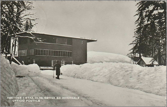 Cartolina illustrata degli anni ‘60 con la nuova configurazione del palazzo delle Poste (coll. D. Ciullini). La nuova stazione turistica si configurò occupando sempre più suolo e sempre più bosco, ma soprattutto erigendo alte cortine murarie che hanno quasi annullato la relazioni visuali tra il passo granducale, il bosco e i crinali. Negli anni ‘50, dal palazzo comunale e dall’ufficio postale di Mazzoni era ancora possibile allungare lo sguardo fino alle piramidi e il paesaggio naturale dominato conferiva ad Abetone un carattere di unicità. Oggi la situazione è ben diversa e quella descritta rimane una visione onirica, ma riscoprire il paesaggio e le architetture del sogno e della memoria può ancora avere un senso che va oltre lo studio storico e la nostalgia. Non si tratta di una mera cartolina ma è un’indagine interiore profonda, volta a scoprire conoscenze, che potranno poi indirizzare il futuro delle nuove generazioni. Il paesaggio è la storia e l’identità di ciascuno di noi. Olga Agostini