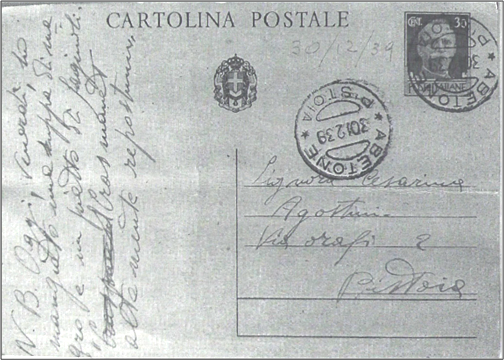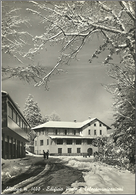 Una delle tre cartoline scritte a casa dal giovane soggiornante alla Colonia Lodolo. 30 dicembre 1939 4 gennaio 1940 5 gennaio 1940 Non il telefono cellulare, bensì l’ufficio postale era il mezzo di comunicazione con la famiglia, per questo il ragazzo si recava qui ogni sera. Era un modernissimo ufficio postale, realizzato da uno degli architetti più interessanti dell’epoca, Angiolo Mazzoni. L’edificio, datato 1936, venne costruito più o meno in contemporanea al Palazzo Comunale, ma i due edifici mostrarono fin da subito caratteri assai diversi, pur essendo espressione del medesimo clima storico. La sede comunale, emblema del distacco di Abetone da Cutigliano, segnava la recente autonomia amministrativa, mentre l’edificio per Poste e Telegrafo rappresentava l’efficiente amministrazione dello stato centrale in quel luogo remoto, entrambi gli edifici rivestivano precisi ruoli di rappresentanza e riferimento istituzionale.