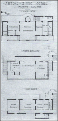 Pianta in scala 1:200 dell’edificio con la posta e il telegrafo ideato da Mazzoni. Immagine tratta dal catalogo Il palazzo comunale venne realizzato in posizione dominante rispetto al tracciato della strada per Modena e faceva da quinta ad un grande piazzale ricavato al posto del bosco, proprio all’arrivo della pista da sci della Selletta. Alla facciata venne conferita un’impostazione simmetrica, che assecondava l’impianto generale, costituito da un corpo centrale più alto e due laterali addossati e più piccoli. Ciascuno con coperture a padiglione o mezzo-padiglione. La massività della struttura venne rafforzata da un austero rivestimento in bozze di pietra squadrata e alleggerita dalle specchiature intonacate di colore chiaro e dal falso bugnato, ugualmente di intonaco chiaro, che inquadrava il portale di ingresso. Le specchiature intonacate conferiscono ancora oggi una maggiore eleganza e snellezza alla struttura edilizia. Si tratta di un edificio monumentale, costruito secondo uno stile tradizionale, adattato al contesto montano, che, insieme con il fondale verde e svettante del bosco sul retro, costituisce uno “scenario”. Il linguaggio semplice e chiaro si mostra immediatamente esemplificativo della sua destinazione d’uso, distinguendosi e distanziandosi dagli edifici già presenti sul luogo e creando un fulcro di riferimento nell’insediamento di Abetone. L’edificio delle poste e telegrafi venne invece edificato con il fronte principale sulla via, che saliva fino al palazzo del Comune, e mostrò un linguaggio architettonico dal carattere modernista, ma fu anche formalmente esemplare rispetto alla dimensione storica rivendicata dal regime fascista. Inequivocabilmente littorio, era capace di lanciare la sfida della modernità in quel luogo di boscaioli sciatori. Un struttura in cemento armato, avveniristica rispetto alla foggia degli abiti degli sciatori che si possono vedere nelle foto dell’epoca, disposta con l’asse maggiore parallelo alla linea di massima pendenza del monte, proprio come una pista da sci.
