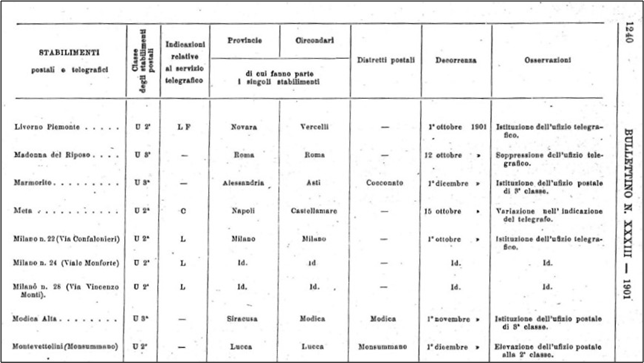 Bullettino postale n. XXXIII, 1901 (ora online in ISSP di Prato).