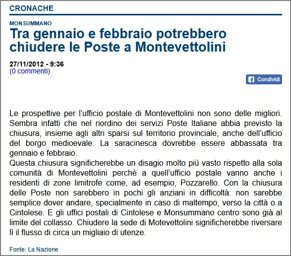 Immagine della sede dell’ufficio postale ancora nel 2013 (tratta da edizione online de Il Tirreno del 18/9/2013)