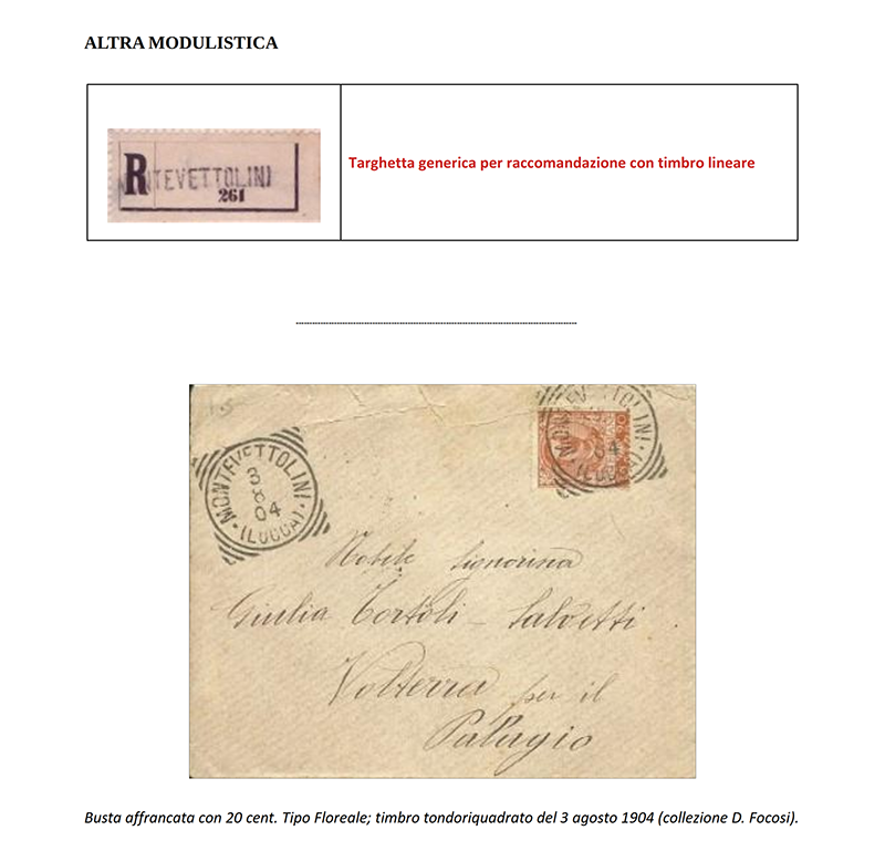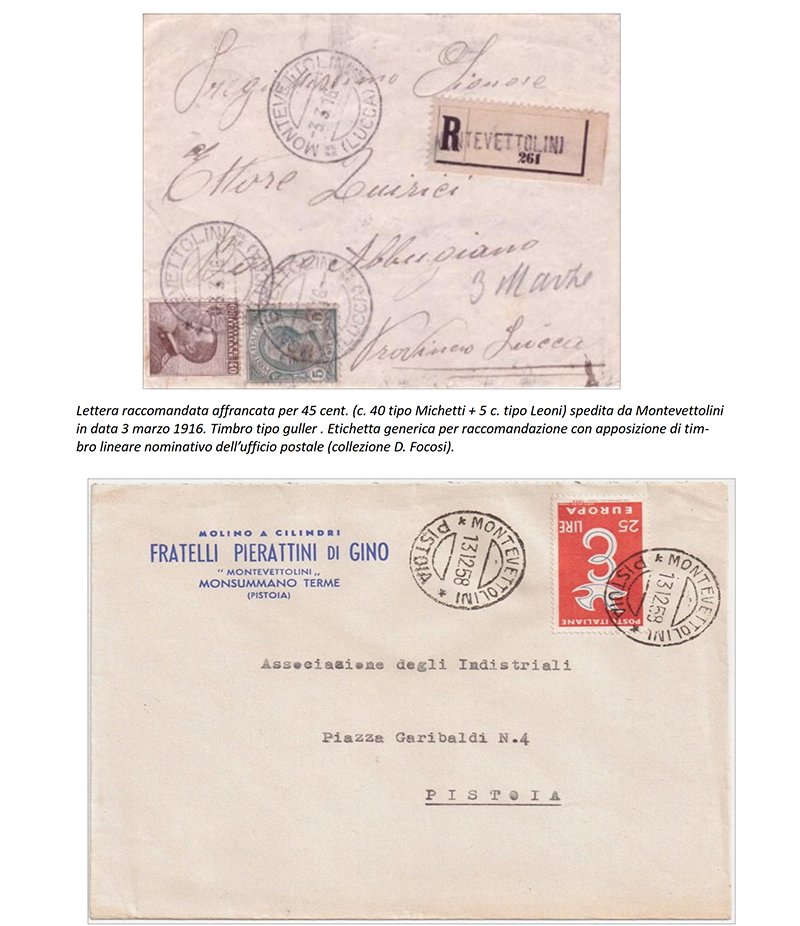 NOTIZIE STORICO POSTALI Viene istituita una collettoria postale di 1ª classe in data 1/7/1899, facente parte del distretto postale di Monsummano Terme, allora circondario e provincia di Lucca. Per le collettorie serviva un ufficio postale vicino ove appoggiarsi, in questo caso era Monsummano. Con la ristrutturazione postale del 1900 le collettorie di 1ª divengono Uffici postali di 3ª classe; nel 1901 l’ufficio viene elevato di grado (2ª classe), indice di una movimentazione postale ben presente e viene istituito anche l’ufficio telegrafico, seppur a orario ridotto (L nelle tabelle sta per limitato), il 1 giugno 1904 e riunito all’ufficio postale. Nell’elenco del 1909 lo ritroviamo sempre U2 (ufficio di 2ª classe). Nel 1912 vi è un’ulteriore risistemazione dell’organizzazione postale: gli uffici si trasformano in rice-vitorie e nell’elenco del 1913 Montevettolini risulta essere Ricevitoria di 1ª classe. Nell’elenco del 1922 risulta essere Ricevitoria di 2ª classe e così pure in quello del 1926. Vi è poi il passaggio del territorio dalla provincia di Lucca alla neo-costituita provincia di Pistoia. L’organizzazione postale pistoiese fa sempre riferimento alla Direzione Provinciale di Firenze e pertanto la variazione del numero frazionario consiste nel prendere quello “fiorentino” (25), numerato a seguire il pre-esistente elenco di frazionari di quel territorio. Pertanto nel 1928 il frazionario di Montevettolini risulta essere il 25/322. L’importanza dell’ufficio va a scendere con lo sviluppo delle località della piana sottostante e nel 1932, con la riclassificazione degli uffici postali (1/7/32), si assiste al “declassamento” da R2 a R3, ultimo gradino degli uffici postali (a seguire sotto collettorie e agenzie). Così appare negli elenchi del 1938 e 1943. Nel frattempo passa la guerra su quei territori. Montevettolini è proprio sopra l’area del Padule di Fucecchio, ove nel 1944 ci sarà una delle più grandi stragi di popolazione civile effettuate in Toscana dai Tedeschi (174 vittime). Nel 1951 la Direzione postale pistoiese acquista la propria autonomia contabile da quella fiorentina; ciò comporta anche l’assunzione di un nuovo numero frazionario con cui identificare gli uffici. Pistoia prende il numero 85 (numero in precedenza usato in A.O.I., regione di Galla e Sidama). Nell’elenco degli uffici del 1954 risulta essere Agenzia. MARCOFILIA Vista la data di apertura della collettoria utilizza fin da subito il timbro tondo riquadrato. Enrico Bettazzi https://it.wikipedia.org/wiki/Montevettolini