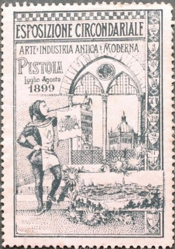 L'Esposizione Circondariale di Pistoia del 1899 fu un evento per promuovere l'industria, la floricoltura e l'orticoltura della zona. Si tenne nei mesi di luglio e agosto e fu dedicata sia all'arte antica e moderna sia ai prodotti del territorio. L'organizzazione fu un'impresa ambiziosa per la città, che volle mettere in mostra i propri prodotti attraverso la manifestazione. Dell’evento a lungo obliato si è interessata recentemente Silvia Mauro, che ha dato alle stampe sia un saggio sulla rivista “Storia locale” che un voluminoso ed interessante libro in cui appaiono immagini dell’evento e di oggetti attinenti, custoditi in moltissime collezioni di Pistoiesi. Tra i vari memorabilia della grande manifestazione di fine ottocento c’è anche un erinnofilo (o chiudi lettera, allora in voga) che ha un formato abbastanza grande (cm. 4x6) ed i margini naturalmente dentellati a mo’ di francobollo.