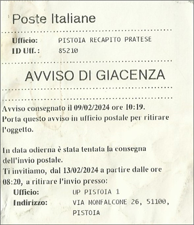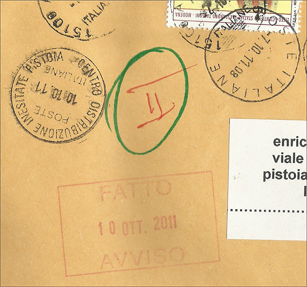 PERCORSO: le schede > Gli uffici postali della provincia di Pistoia > questa pagina > Uffici di posta di Pistoia e provincia Abbiamo visto la trasformazione attuata nella struttura postale agli inizi di questo millennio da parte di Poste Italiane anche nella provincia pistoiese. https://www.ilpostalista.it/pistoia/931.htm Per il capoluogo, dopo una prima separazione fisica degli uffici centrali pistoiesi, con l’ufficio postale di Pistoia C.P. (Corrispondenza e Pacchi) trasferito dai locali della sede centrale cittadina, ove è presente anche la Direzione Provinciale, alla nuova sede in Via Cellini in località S. Agostino, prima periferia e località a vocazione industriale, in cui variò la propria denominazione in C.P.O. (Centro Postale Operativo), nei primi anni duemila si costruì ad hoc una nuova sede pluriservizi poco distante (Via Pratese). Attuale sede dei locali di recapito di Pistoia in Via Pratese (immagine satellitare tratta da Google Map). Con la nuova struttura, da cui dipendono i portalettere e i vari servizi accessori di distribuzione, si dovette adeguare anche tutta la documentazione accessoria compresi i timbri in dotazione ai vari servizi. Ad oggi, dopo una ulteriore restrizione dei timbri datari (non più usati per data-certare i documenti circa dal 2017) e le “gite” dei postini ridotte in settimana a giorni alterni di consegna, è diventato raro l’utilizzo del timbro datario. Intanto fin quando la consegna era giornaliera il postino nella consegna delle raccomandate ci provava almeno due volte in successione; lasciava un avviso e annotava le gite a vuoto sull’oggetto postale da consegnare. A corroborare la mancata presenza del destinatario venivano apposti anche timbri dall’ufficio distributivo. Esempio delle annotazione delle due gite effettuate dal postino con assenza del destinatario. Corrispondenza proveniente da Asti (Cap 15100) con timbratura del 7/10/2011 per la mancata consegna in quella data; annotazione in rosso cerchiato di verde della seconda gita effettuata, timbro in cartella rettangolare FATTO AVVISO per la seconda gita a vuoto il 10/10 e consegna all’ufficio PISTOIA CENTRO DISTRIBUZIONE INESITATE, sito nello stesso plesso e aperto al pubblico, per il ritiro in giacenza dell’oggetto postale. Fino a qualche anno fa per rendere evidente il percorso reiterato della missiva si apponeva un timbro datario generico POSTE ITALIANE. Secondo le notizie raccolte da Alcide Sortino la trasformazione dell’ufficio pistoiese di distribuzione ha avuto un duplice passaggio, con la trasformazione del CDM (Centro Distribuzione Master) con frazionario assegnato 85/210 in CPD (Centro Primario Distribuzione) a fine 2006 con nuovo frazionario 85/212. Tabella storico postale di Alcide Sortino. Come si può notare l’ufficio di distribuzione ha assunto la denominazione RECAPITO PRATESE mutuando il nome della strada da cui si accede al plesso (così come in precedenza il CPO in Via Cellini ne aveva anch’esso preso la indicazione, tanto che i pistoiesi dicevano “vado al Cellini” quando vi si recavano). Anche oggi quando viene lasciato un avviso di recapito per mancata consegna l’indicazione dell’ufficio di distribuzione mantiene la primigenia dizione PISTOIA RECAPITO PRATESE con il suo originario numero frazionario 85/210. Attualmente non essendo più operativo presso il plesso il servizio di giacenza per le inesitate , questo viene appoggiato sull’ufficio postale generalmente più vicino all’indirizzo di consegna. I locali del centro distributivo, ospitando più servizi attinenti, oltre ad un ufficio postale aperto al pubblico (Pistoia 5), hanno avuto, come detto, sezioni e funzioni operative varie, talvolta mantenendo, come vedremo nel catalogo dei timbri, la dizione operativa di C.P.O. (Centro Postale Operativo) anche quando questa denominazione era già sorpassata da una nuova struttura organizzativa. Enrico Bettazzi CATALOGO SEGNI UTILIZZATI NELLE DIDASCALIE Ω immagine del corno postale * asterisco * stella ▫ altro motivo Ringraziamo per le notizie e le immagini forniteci A. Sortino, A. Caroli, M. De Lorenzo, M. Biondi, E. Nappini.