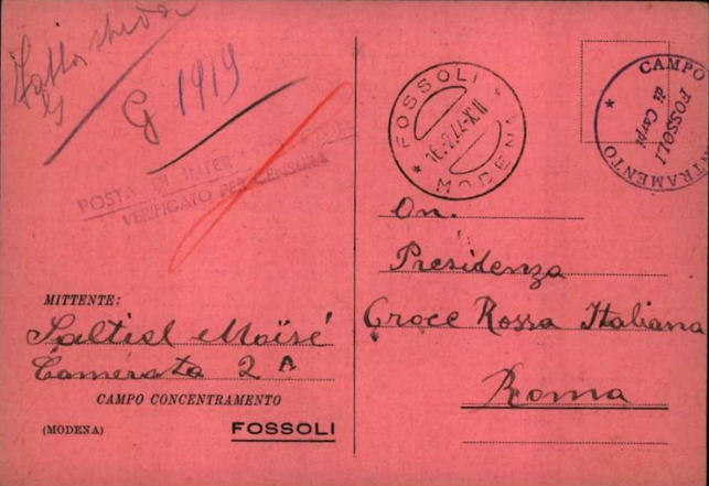 “Firenze 14.7.43 XXI Ai primi di settembre del ‘43 Olga lasciò volontariamente Milano e si riunì al resto della famiglia. Con l’armistizio dell’8/9/43 avrebbero potuto allontanarsi, ma il maresciallo dei carabinieri consigliò loro di disperdersi nella campagna circostante, non prima di avergli lasciato il recapito contro promessa che mai lo avrebbe rivelato ad altri. Nel frattempo Sem Grassi aveva fatto nascondere Alfredo presso un suo amico contadino a Le Querci, nella campagna intorno Agliana. Era iniziata la latitanza di Alberto Alfredo, mentre i genitori erano rimasti alla pensione dei Grassi. Nel dicembre 1943, il nuovo comandante di stazione dei carabinieri ad Agliana confiscò i beni dei Saltiel e il 24 gennaio 1944, radunati gli ebrei presenti in loco (6 persone), li consegnò ai tedeschi per la deportazione: finirono ad Auschwitz e nessuno si salvò. I genitori transitarono dal Campo di Fossoli, vicino Carpi: il padre Moisè cercò scrivendo il 13 febbraio 1944 alla Croce Rossa di farsi dare un qualche sostegno, essendo stati privati di tutto; non ci fu il tempo... il 22/2/44 furono caricati in treno per la destinazione finale: probabilmente per la loro età furono subito condotti alle camere a gas (Moisè fu ucciso all’arrivo il 26/2, forse anche Olga ma non vi è certezza). Riportiamo il testo dell’appello di Moisè: