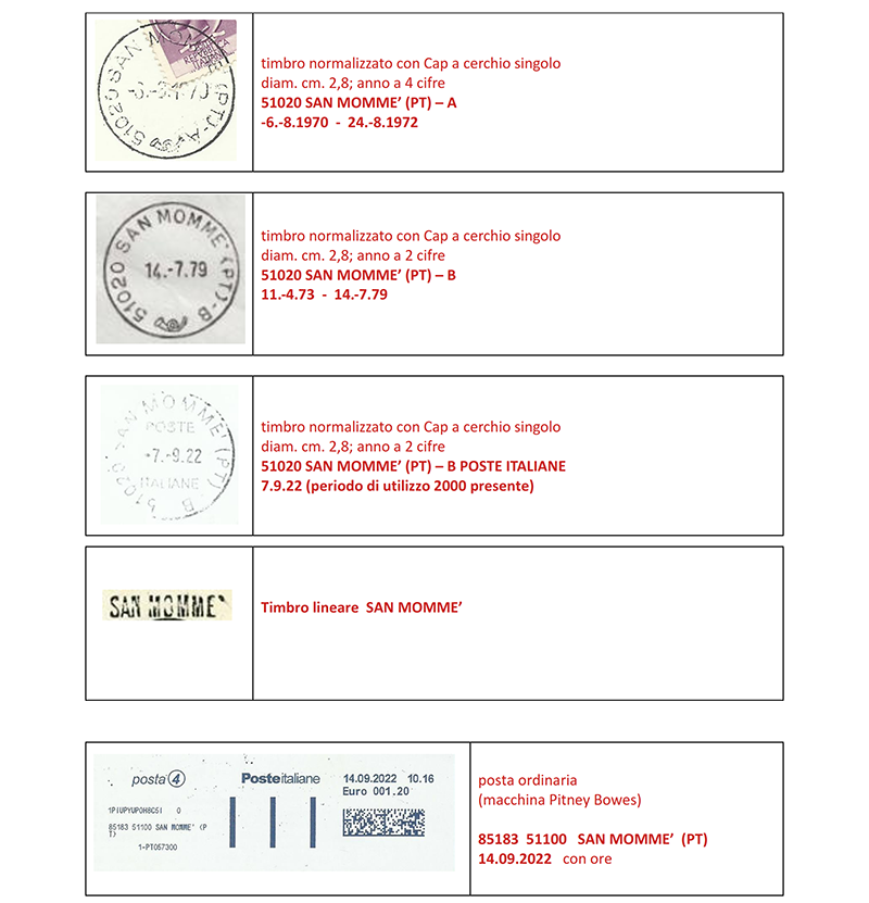 MARCOFILIA Come per molti toponimi con dedicazione a santi, si è assistito nel tempo a diverse varianti nel lettering degli annulli datari, talvolta scrivendo per esteso l’attribuzione di santo, talvolta riducendola alla sola S puntata. E’ anche il caso di San Mommè, talvolta indicato in tal maniera, oppure come S. Mommè. La prima tipologia di bollo alla istituzione della collettoria nel 1903 fu il tondo riquadrato (catalogo Gaggero /Prudenzano). Per questa tipologia si conosce l’uso (secondo la schedatura di tipi in catalogo) di tipo G sia in inchiostro nero che in azzurro (vedasi segnalazione di L. Teti in bibliografia). Il catalogo in questione ne segnala l’utilizzo fino al 1917. Si è poi passati al “tipo guller” col frazionario fiorentino (25/178) e poi a quello con l’indicazione della neo costituita provincia (1927). Questa tipologia di annullo ha avuto una lunga vita, come per molti altri piccoli uffici della montagna, è sopravvissuto fino alla “normalizzazione” e l’assunzione del codice di avviamento postale. Se ne conoscono anche usati con inchiostro azzurro nel secondo dopoguerra. Con l’introduzione del C.a.p. e la “normalizzazione” del 1967/1969, è stato introdotto il generico 51020 della montagna pistoiese e le lettere distintive A e B. Attualmente l’ufficio ha ancora in uso un timbro con dizione Poste Italiane e lettera B, per cui si suppone che abbia avuto in dotazione anche la A. Essendo nel Comune di Pistoia ha correttamente l’indicazione del C.a.p. 51100 nella TP Label e nell’indirizzo sul sito di Poste Italiane, da quando è stato adottato il C.a.p. del comune capoluogo per facilitare la distribuzione postale. Si segnala che sono noti alcuni casi di utilizzo di timbro muto in emergenza nel periodo ottobre/novembre 1959 (12/10/59-2/11/59), per una qualche mancanza del timbro in uso allora all’ufficio.