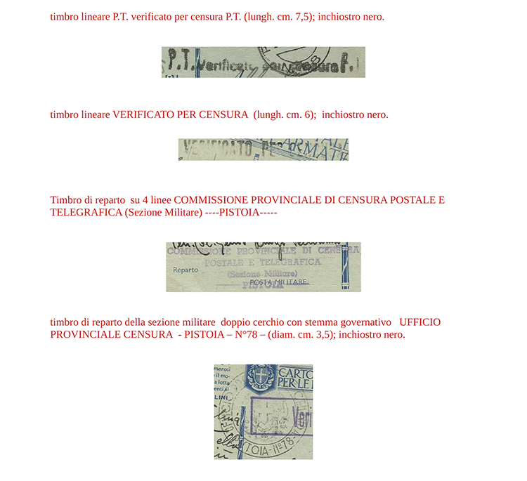 Sirotti nei suoi articoli ne riporta di varie fogge; per Pistoia mancano ad esempio i piccoli timbri rettangolari numerati presenti ad Arezzo (si rimanda alla visione dell’articolo citato di Monticini). Sempre restando nel confronto con Arezzo, in epoca post armistiziale, durante il controllo della A.M.G., sia Arezzo che Pistoia furono funzionalmente sottoposti ad altri centri (Arezzo a Siena e Pistoia a Firenze), ma perlomeno al centro aretino vennero assegnati due timbri di censura “ a ponte” specifici, mentre al momento per Pistoia non siamo a conoscenza di alcun timbro di tale tipologia assegnato. Forse, come vedremo più avanti, ciò potrebbe esser derivato anche dai tempi di uso più ristretti nel territorio pistoiese: per Arezzo dal Luglio 1944, per Pistoia dall’Aprile 1945. Tra i timbri pistoiesi presente invece il timbro rettangolare di prelievo e restituzione delle corrispondenze, in due fogge.