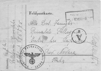 | Biglietto franchigia tedesco da militare italiano della Divisione Monterosa. Numero manoscritto al verso 82414, spedita tramite la posta civile da Kalsruhe 24.6.44. Bollo di franchigia "Ausb.Kdo V (Geb) Pi.Batl.4 Briefstempel Feldpost". In questo caso è normale l'uso del bollo civile presso un campo secondario. |
