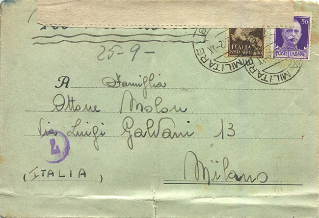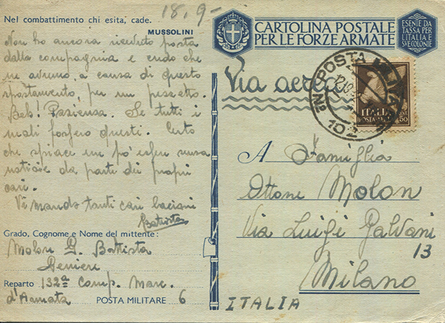 Il giorno 16 settembre abbiamo un biglietto postale a foggia dei biglietti in franchigia distribuiti per le Forze Armate, come ne abbiamo visti precedentemente nella corrispondenza. È inoltrato per via aerea attraverso l’ufficio di posta militare n. 108 in data 17.9.42. Giunge a destino il giorno 25.9.