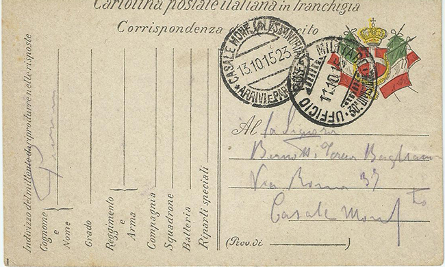 N. 1 - Già una delle prime cartoline postali in franchigia distribuite alle truppe, è datata ottobre 1915. Il mittente si firma solo Pierino, si osservano le disposizioni in vigore, tanto i destinatari sanno di chi si tratta.