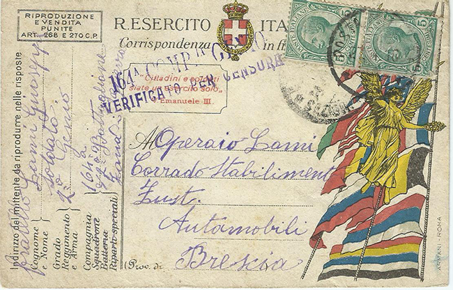 N. 2 - Siamo a fine guerra datata aprile 1918, è persistente la verifica della censura operata dallo stesso reparto di appartenenza. Non è indicata la zona di dislocazione ma una generica “zona di guerra”.