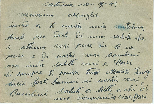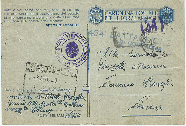 N. 3 - E’ una cartolina in franchigia ma della 2° guerra mondiale e indica una rilevanza storica. E’ datata il 10 luglio 1943, luogo di invio è Catania esattamente nella giornata in cui le forze anglo americane sottopongono la fascia costiera est della Sicilia ad intenso bombardamento. Non fu recapitata, ma restituita alla posta per un successivo inoltro, probabilmente avvenuto in tempi successivi. E’ confermato che il 434° battaglione di Fanteria costiera, facente parte della 213° Divisione costiera, era schierato a sud di Catania fino ad Agnone/Priolo.