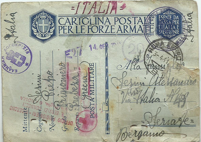 N. 5 - Cartolina di origine italiana in uso al campo di concentramento per prigionieri italiani in Grecia. Evidentemente bottino di guerra. Il campo di concentramento per prigionieri italiani era a Preveza. Dopo l’occupazione italiana nel 1942 la struttura fu utilizzata dalla 139° squadriglia della Regia Aeronautica.
