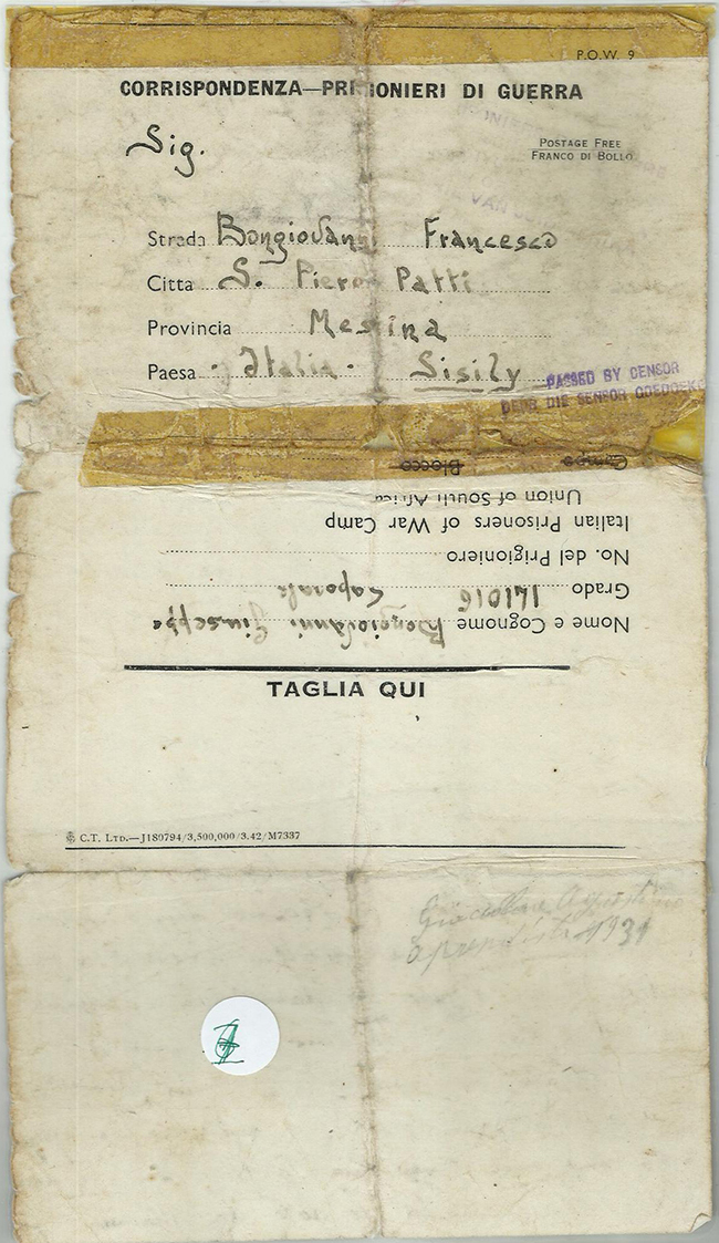 N. 6 - Anche ai prigionieri italiani in Sud Africa era permesso inviare e ricevere posta dalla famiglia. Se ne occupava la Croce Rossa Internazionale. La posta è sottoposta a censura.