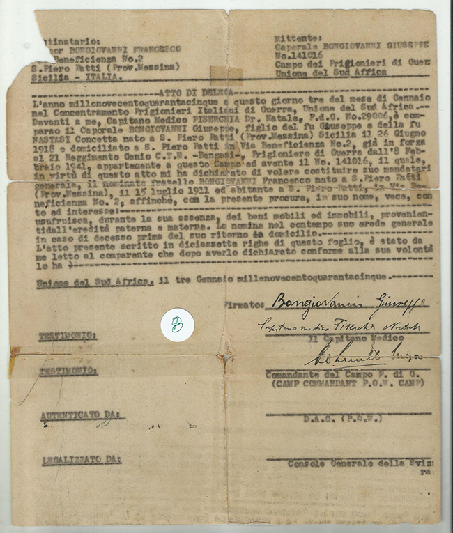 N. 7 - Questo è un pezzo molto interessante, fermo restando la presenza nel campo di prigionia in Sud Africa, fu possibile redigere una procura notarile per la fruizione, a qualsiasi titolo, della sua quota di proprietà di immobile dell’eredità paterna e materna. | ||||||||||||||