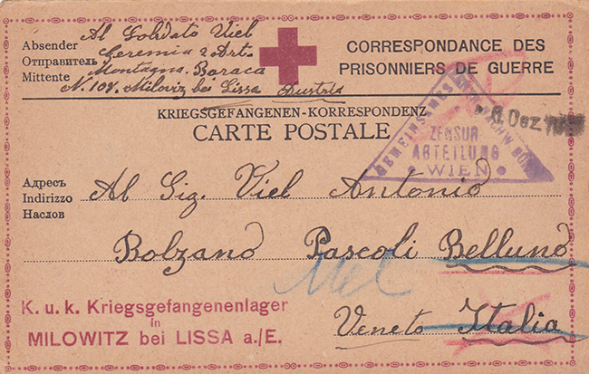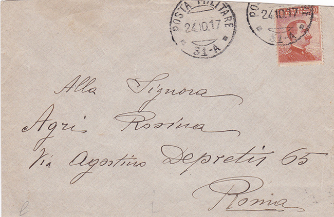 24 ottobre 1917. Dalla posta militare 51-A per Roma. L’intero Friuli, tutta la provincia di Belluno e parte delle altre province vennero duramente occupate dal nemico, provocando una crisi alimentare senza precedenti: l’anno della fame. Non esisteva nessun modo per i residenti nelle zone occupate di comunicare liberamente con il territorio libero se non in casi sporadici attraverso la croce rossa, corrispondenza sottoposta a censura, nessuno sapeva a quali gravi privazioni furono sottoposti gli abitanti del territorio invaso.