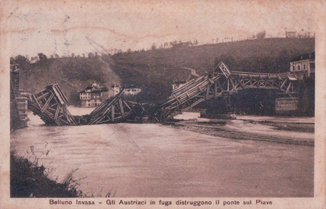 Gli austro-ungarici in ritirata da Belluno, distrussero il ponte sul Piave da loro stessi costruito.
