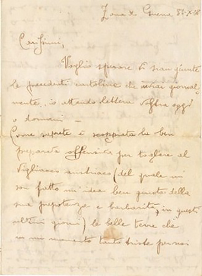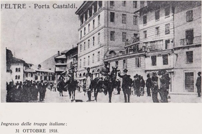 L’ingresso delle truppe italiane a Feltre il 31 ottobre 1918. Gli Alpini dei battaglioni “Pieve di Cadore” ed “Exilles” a mezzogiorno del 31 entrarono a Seren dove sbaragliarono le ultime resistenze austriache liberando alle 17:30 la via per Feltre, tuttavia in alcune zone della città si combatté ancora fino a notte quando i nemici si dileguarono. Il 1° novembre fu la volta della liberazione di Belluno, dove, alle 11:00, entrarono una pattuglia del 253° fanteria proveniente da Ceresera e un pattuglione della 48° Divisione composto da trenta arditi della Brigata Aquila. La liberazione fu portata a termine alle 15:00 con l’occupazione dei posti di comando a seguito dell’ingresso della Brigata di Gaetano, del 254° Reggimento Fanteria, insieme al 72° reparto d’assalto, di un battaglione d’artiglieria da montagna e di un plotone del genio zappatori (5). Egli fu inviato subito alla stazione ferroviaria per sgominare l’ultima resistenza nemica e contribuì a mettere in sicurezza la città. Durante l’avanzata e nei giorni trascorsi a Belluno Gaetano scrisse alcune cartoline postali e lettere; in questi scritti raccontò ai familiari ciò che vide e ascoltò dalla viva voce dei rurali incontrati lungo il cammino. Nei giorni dell’attacco e in quelli che seguirono il passaggio del Piave, naturalmente, non ebbe tempo per scrivere. La sua prima lettera è del 31 ottobre, probabilmente quando era fermo a Revine prima di inerpicarsi sul ripido versante del monte: «Zona di guerra 31 - X – 18. Carissimi, voglio sperare vi sian giunte le precedenti cartoline che inviai giornalmente, io attendo lettere vostre oggi o domani. Come saprete è scoppiata la ben preparata offensiva per togliere al vigliacco austriaco (del quale mi son fatto un’idea precisa della sua prepotenza e barbarità in questi ultimi giorni) le belle terre che in un momento tanto triste per noi ha potuto calpestare, anzi dirò così occupare, perché il bravo soldato italiano se avesse voluto impedirlo sarebbe stato capace… Che giornate indimenticabili! Il nemico fugge, noi esultanti di vittoria. Come avrete letto dai giornali ch’io sinora non ho visto, parecchi paesi sono stati conquistati e parecchi ancora si occuperanno, il passaggio per le cascine, pei villaggi fa piangere dalla gioia noi e gli abitanti che espongono bandiere, che accettano pane e che contraccambiano con fiori, dei quali serbo alcuni grisantemi.».