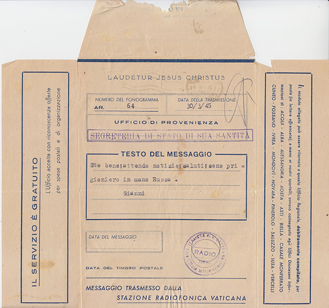 | Modulo avente la forma di un telegramma con il quale la Gioventù Italiana di Azione Cattolica – Ufficio regionale Informazioni di Torino comunicava alle famiglie il testo del messaggio trasmesso dalla Radio Vaticana, che a sua volta l'aveva captato da Radio Mosca. Il modulo riprodotto fu spedito il 31 marzo 1945 ad una famiglia in provincia di Vercelli, affrancato per 1 lira, con un francobollo della serie “Monumenti distrutti” della R.S.I. |