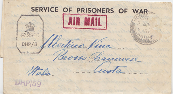 Foglio lettera scritto il 25/05/1942 da un internato civile nel campo n. 22 di Clement Town in India, spedito da Bombay il 2 giugno. Francobollo per la tassa aerea (8 annas) asportato. Considerato che il mittente risulta libero fino a luglio del '41, è molto probabile che sia caduto in prigionia in una località diversa dall'India, probabilmente in Iran, che cadde sotto il controllo inglese nell'agosto del '41.