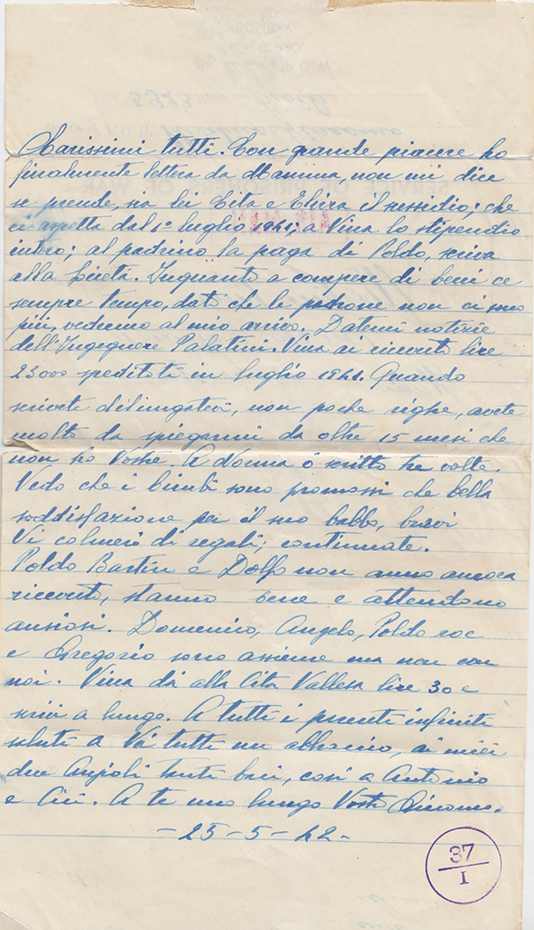 Carissimi tutti. Con grande piacere ho finalmente lettere da mamma, non mi dice se prendete, sia lei, Cita e Elvira il sussidio; che ci aspetta dal 1° luglio 1941; a Vina lo stipendio intero; al padrino la paga di Poldo, scriva alla Società. In quanto a comprare beni, ce sempre tempo, dato che le padrone non ci sono più, vedremo al mio arrivo. Datemi notizie dell'ingegnere Palatini. Vina ai ricevuto lire 25.000 speditoti in luglio 1941. Quando scrivete dilungatevi, non poche righe, avete molto da spiegarmi da oltre 15 mesi che non ho vostre. A nonna ò scritto 3 volte. Vedo che i bimbi sono promossi che bella soddisfazione per il suo babbo, bravi vi colmerei di regali; continuate.
