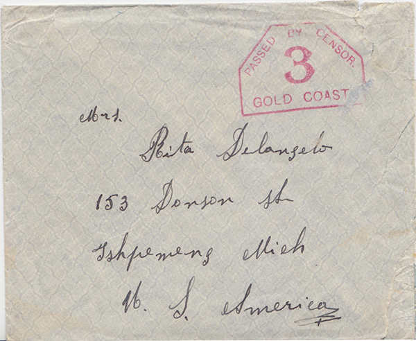 Lettera scritta in un campo della Gold Coast, probabilmente da un minatore bergamasco che era internato insieme ad un altro congiunto, diretta ad altri familiari negli Stati Uniti. Riepiloga, in poche parole, l'emigrazione da alcune desolate valli del Nord Italia e la sventura che si aggiunse alla povertà, ma anche la fiducia che le cose prima o poi sarebbero cambiate.