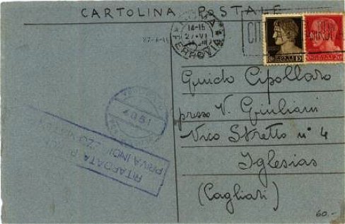Corrispondenza con i reparti in zone occupate Il servizio posta militare nel regno del sud aveva un grave problema: far giungere la posta tra le diverse parti del regno e tra questo e le zone di occupazione alleata (Sicilia, Calabria, Napoli etc) Dal mese di ottobre si poté riprendere le comunicazioni tra la Sardegna e la Puglia. Il 20 dicembre il collegamento si estese a tutto il sud peninsulare. Il 10 gennaio 44 si aggiunse la Sicilia e il 20 marzo Napoli e parte della provincia. Dal 17.6.44 fu possibile corrispondere con Roma. Queste limitazioni uguali a quella civile furono superati con due accorgimenti. La prima consistette nel ritenere la posta militare, diretta a enti come posta ufficiale e quindi trasmissibile tramite le prefetture. L’altra occulta, strana, irregolare venne effettuata per i collegamenti tra la Sardegna, la Puglia e la Sicilia dai primi giorni di ottobre 43 al 9 gennaio 44. Non vi è nessuna comunicazione o nota ufficiale al riguardo. Anzi diverse la negano, come la nota del 28 dicembre dello Stato Maggiore Esercito che afferma “…il trasporto si effettua a mezzo ferrovia per il continente con i servizi di messaggeria sulle linee in funzione; a mezzo aereo tra il continente e la Sardegna oltre a un collegamento aereo trisettimanale tra Brindisi e Napoli.” Nessuna parola su un collegamento con la Sicilia. Eppure vi sono numerose corrispondenze di militari che affermano, fin dai primi giorni di ottobre, che si può corrispondere con la Sicilia a un fantomatico servizio aereo. Vi sono corrispondenze dirette in Sicilia e recapitate durante il blocco postale; vi sono lettere che non portano bollo di arrivo e quindi non è possibile certificare la consegna; vi sono infine lettere partite dal continente e la Sardegna e recapitate dopo la ripresa dei servizi postali. Tutto ciò porta alla conclusione che vi è stato un canale privilegiato per far passare la posta militare durante il periodo del blocco postale con la tacita o esplicita approvazione alleata, per la sola posta del regno e Sardegna e verso la Sicilia (Fig. 31).
