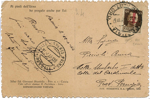 Sul fronte e al retro sono presenti i bolli di censura della provincia di Perugia e sul retro bolli di censura di prelievo e restituzione alle poste e il bollo di arrivo a Rivanazzano.