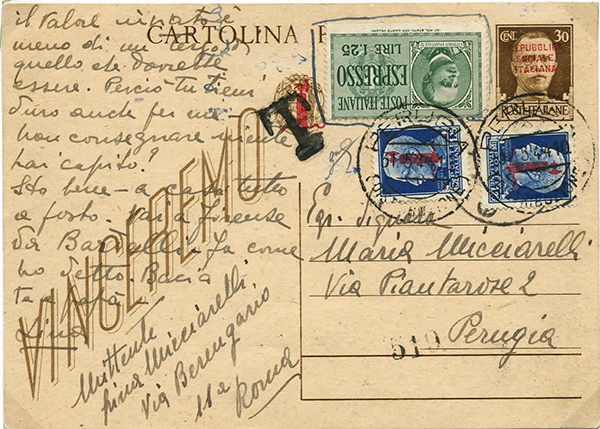 In Umbria la distribuzione avvenne con un sensibile ritardo, una cartolina Vinceremo (come supporto) affrancata