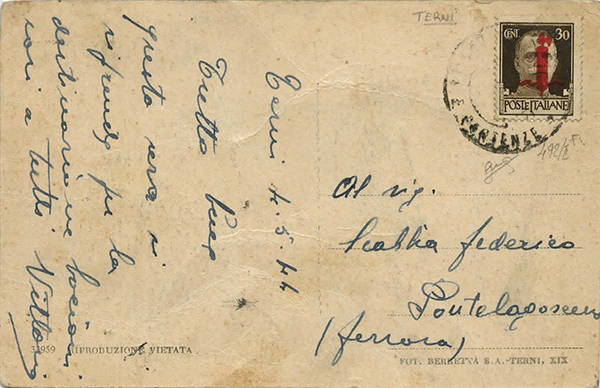 La lettera venne approntata il 30.6.1944 (Perugia liberata il 20.6.1944) e spedita alla riapertura dei collegamenti con Gaeta.