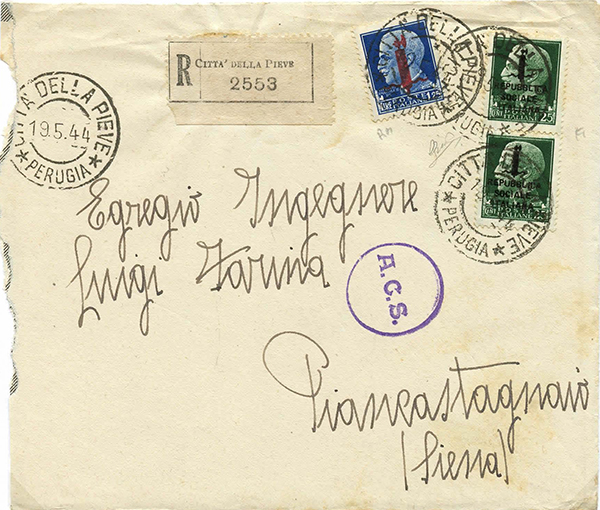 Straordinaria e Rara in Umbria l'integrazione in contanti per il porto di raccomandazione, (causa carenza francobolli). Bollo lineare ACS del servizio di censura alleato, identificata e non censurata la lettera venne bloccata causa eventi bellici, gli Alleati arrivarono il 24.6.1944, bollo di arrivo a Cortona 31.12.1944 (Cortona dista 30 km. da Perugia) |