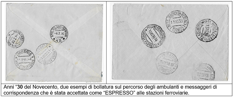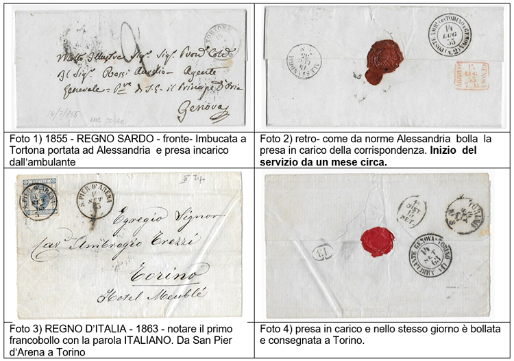 Nei primi anni dell'Unità d'Italia, dal 1861 i trasporti via mare ebbero maggior sviluppo per le difficoltà incontrate nei trasporti stradali (soprattutto al Sud), i natanti in questione si limitarono al trasporto da una località principale all'altra dei sacchi di corrispondenza affidati ai concessionari delle "vie di mare", in alcuni casi furono muniti di cassette postali di impostazione ma ebbero scarso successo. Fra le difficoltà incontrate dal novello Regno d'Italia ci furono sicuramente le carenze di comunicazioni terrestri fra le varie regioni dello stivale, dovute ad un non omogeneo sviluppo stradale e ferroviario, ereditato prevalentemente da organismi privati concessionari degli “Antichi Stati” in cui erano praticate prevalentemente con carrozze a trazione animale. Uno dei mezzi essenziali per accelerare la trasmissione delle corrispondenza fu l’integrazione della ferrovia e dei treni muniti di “ambulante postale” vale a dire carrozze ferroviarie trasformate in ufficio postale viaggiante. Con una rete ferroviaria abbastanza servita al Nord e con gli ambulanti postali sui mezzi ferroviari si ebbe un rapido abbassamento dei costi ed incremento della velocità del servizio postale a media e lunga distanza. Gli ambulanti furono uffici importantissimi, specie i ferroviari che rappresentavano l'integrazione fra le ferrovie (allora il mezzo di trasporto principale perché innovativo, economico, veloce) e le Regie Poste; entrambi i servizi erano stati sviluppati e incrementati con ogni sforzo dal Regno d'Italia per accelerare il trasporto con forte risparmio economico. 1863 - Trasporto della corrispondenza, costi comparati (da relazione Poste Italiane) Le ferrovie erano state integrate con i servizi postali da vecchia data, anzi, erano state prevalentemente utilizzate in ambito locale, quando le ferrovie erano ancora private e divise secondo gli Antichi Stati. Ogni comparto ferroviario nello stato di appartenenza aveva organizzato un proprio servizio postale di trasporto comprendente a volte anche la distribuzione a domicilio effettuata nelle città servite dalla ferrovia; qualche troncone (gestito da privati) ha continuato a esercitare questo servizio anche dopo l'Unità d’Italia fino al 1 Gennaio 1863, quando entrò in vigore il Regio Decreto sulla privativa postale emesso nel Maggio 1862. Il primo servizio ferroviario dedicato al trasporto della Posta fu quello del Regno di Sardegna, con l’istituzione dell’ambulante postale che era stato istituito dal 1° Giugno 1855. (FOTO-1 e 2) Faceva servizio ferroviario fra Torino e Genova ed era caratterizzato dai numeri (1) e (2) secondo se la tratta percorsa era in andata o in ritorno. Dopo l’Unità D’Italia venne modificato il bollo (FOTO 3 e 4). Successivamente gli ambulanti furono uffici importantissimi, specie i ferroviari che rappresentavano l'integrazione fra le ferrovie (allora il mezzo di trasporto principale perché innovativo, economico, veloce) e le Regie Poste; entrambi i servizi erano stati sviluppati e incrementati con ogni sforzo dal giovane Regno d'Italia. Gli "ambulanti ferroviari" erano veri uffici postali dipendenti da una Direzione Postale; erano montati su carrozze ferroviarie e utilizzati per accelerare il lavoro di smistamento della corrispondenza effettuato durante il trasporto da una località all'altra con indubbi vantaggi; erano diretti da un responsabile del servizio, disponevano di timbri e di francobolli, erano muniti di cassetta postale (accessibile dall'esterno del vagone postale) che raccoglieva la posta imbucata dagli utenti durante le soste nelle stazioni.