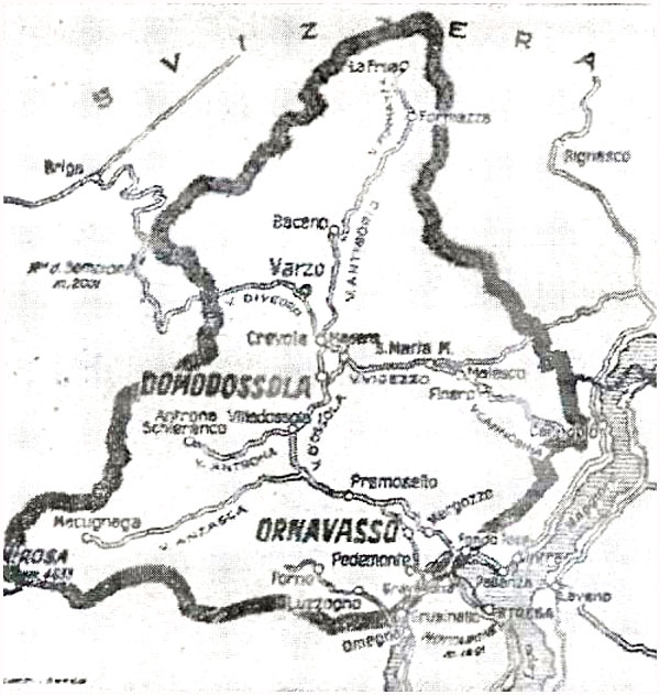 Questo documento in sostanza collega l'emissione decisa dalla Giunta di Governo dell'Ossola partigiana con la delibera della medesima del 20.9.1944, ai francobolli prelevati presso l'ufficio postale in pari data dallo stesso E. Tibaldi ed alle cosiddette "Prove di Lugano" già da tempo conosciute (ossia quei francobolli, noti in filatelia, della serie imperiale e della RSI soprastampati in numero limitato a Lugano con la dicitura su tre righe: C.L.N./Ossola libera/10.9.44). Inoltre individua in Odoardo Plinio Masini, allora residente in Svizzera, il possibile soggetto incaricato ad eseguire dette soprastampe in terra elvetica, propedeutiche ad ottenere le autorizzazioni richieste alle autorità internazionali e quale possibile custode e/o detentore di un archivio e/o di un carteggio riguardo a questo specifico tema. Luigi Pirani NOTA DI REDAZIONE La cartina della Repubblica dell'Ossola è stata ripresa da: |