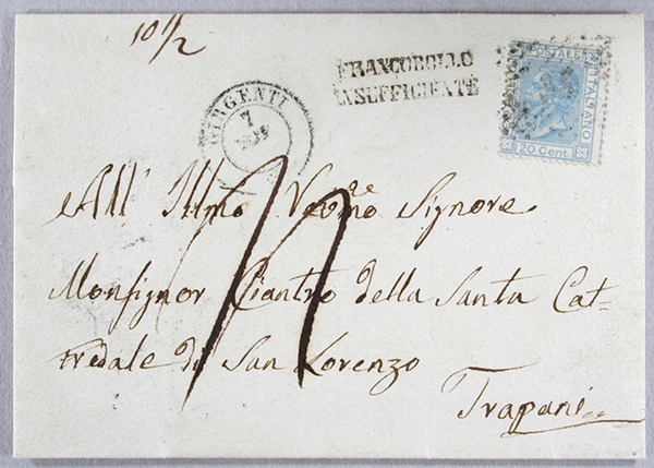 7.11.1872. - Lettera da Girgenti (ora Agrigento) a Trapani. In sede di verifica si appurò che superava di mezzo grammo (10 1/2 nell'angolo in alto) il primo porto delle lettere. Venne apposto il bollo FRANCOBOLLO INSUFFICIENTE e si scrisse a penna"4", segno che indicava la tassa da pagate: 4 decimi di lira, ovvero 40 centesimi, il doppio della tassa evasa. Lorenzo Oliveri | ||||||||||||||