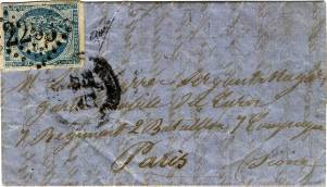 Fig. 4: 14 novembre 1870: biglietto affrancato con cent. 10 obliterato “Paris/St. Lazare”, portato fuori dalla Capitale dal portalettere Gribert d’Amiens (?)