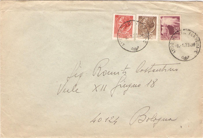 | 6 gennaio 1963 R14 – Lettera da Modena a Bologna (tariffa 50 lire) affrancata con 10 e 20 lire della Siracusana + 20 lire di Democratica. |