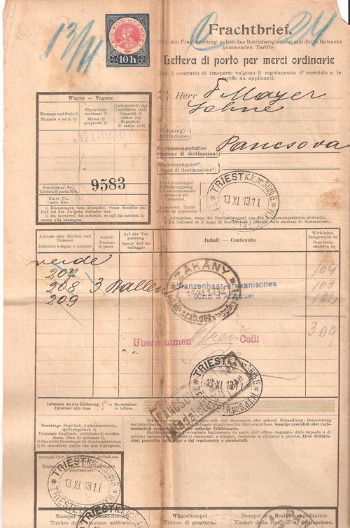 Frachtbrief, Ciao Roberto, sono di nuovo qui a chiedere lumi. Ho trovato il documento che ti allego, assieme al particolare di un timbro: il modulo si chiama Frachtbrief, in italiano dovrebbe essere Lettera di Vettura, probabilmente accompagnava della merce spedita per ferrovia da Trieste per altra località dell'impero asburgico.Il timbro riporta come di consueto in dicitura bilingue: TRIEST K.K. pr. Südb.G. ---- TRIESTE I.R. pr. S.d.F.M. il cui significato dovrebbe essere "Trieste Imperiale e Regia Società delle Ferrovie Meridionali" (ma "pr." cosa vuole dire?)Al centro c'è la data di spedizione 13 XI 13 e compaiono timbri di transito o arrivo di altre località e altre date. E' da considerarsi un documento postale? Il timbro è riconducibile ad un ufficio postale? Se sì, un ufficio fisso, o ambulante ferroviario? Grazie e cordiali saluti. A presto Paolo