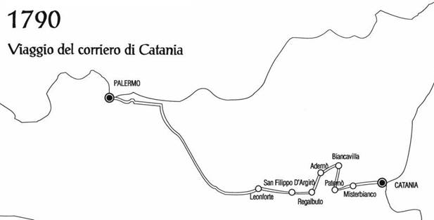 Figura 1 – I percorsi postali via terra in Sicilia secondo il piano del 1790