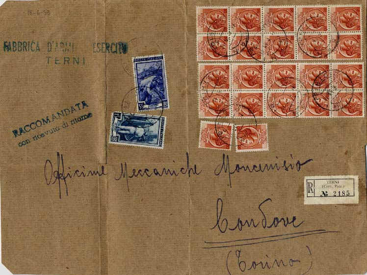 Grande frammento di lettera raccomandata di 71 porti da Terni per Condove (To) del 18.6.1953. La lettera e' affrancata con L.15 e L.55 "Italia al Lavoro" e con 22 pezzi, tra cui due blocchi di 10, del valore da