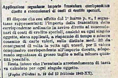 Il servizio di richiesta ricevimento espresso della corrispondenza come per tutti i servizi speciali tipo l'affrancatura eseguita dagli addetti postali e il pagamento delle cartoline di risposta a carico, obbligava ad aprire un conto di credito speciale e ad ogni oggetto in arrivo era applicato il costo dell'affrancatura con segnatasse. Questo fino alla normativa del 1942 che modificò la procedura prescrivendo di tassare collettivamente su Mod. 42 con segnatasse di valore elevato. Perciò in questo caso la tassazione per il servizio espresso (ottenuto con apertura di conto) é stato fatto alla fine del mese su modulo collettivamente, contro deposito della cifra prevista per il mese successivo.